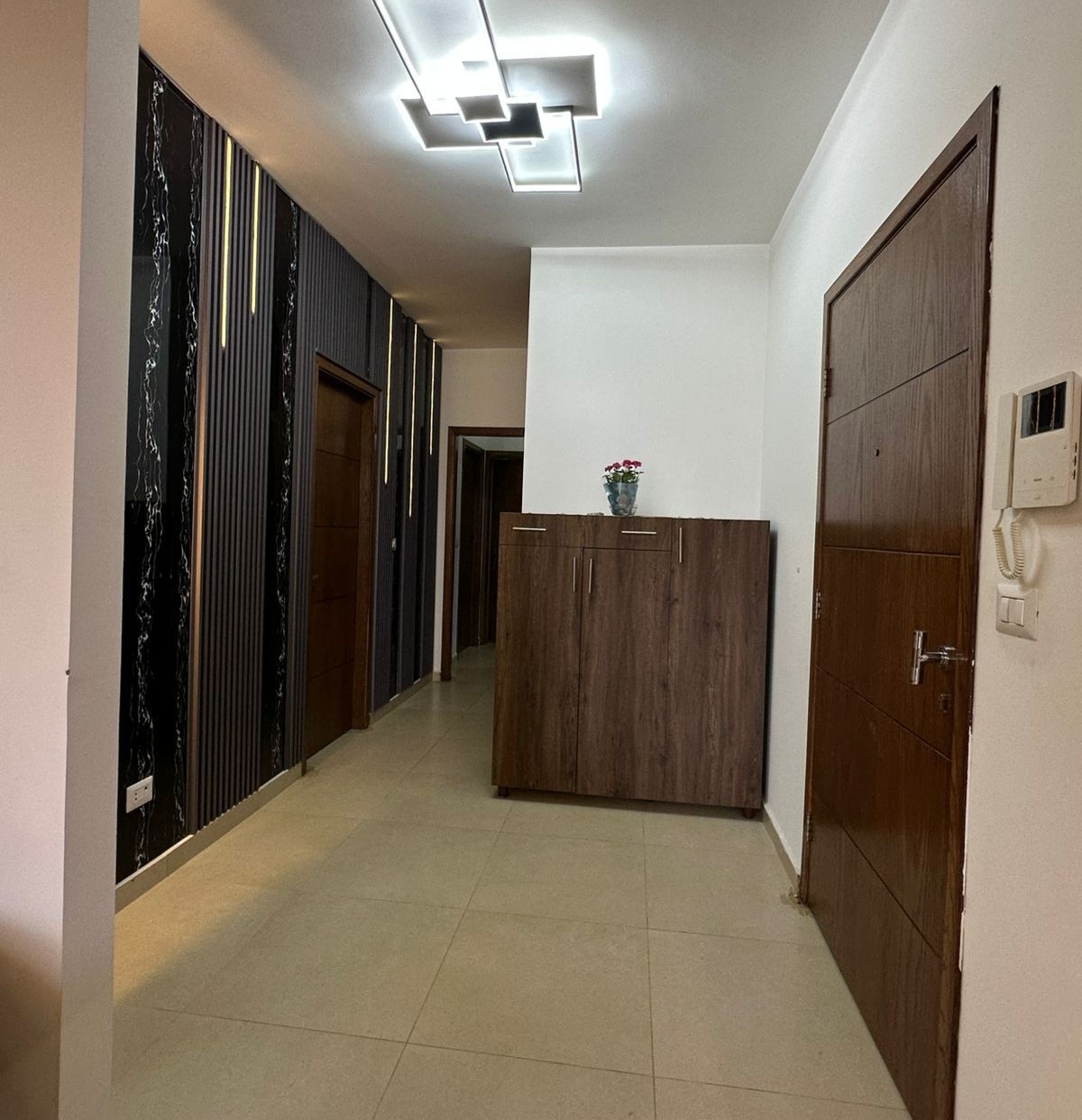- الحالة: تقع في بناية جديدة، الشقة مسكونة لفترة وجيزة جداً وبحالة “الجديد” تماماً
